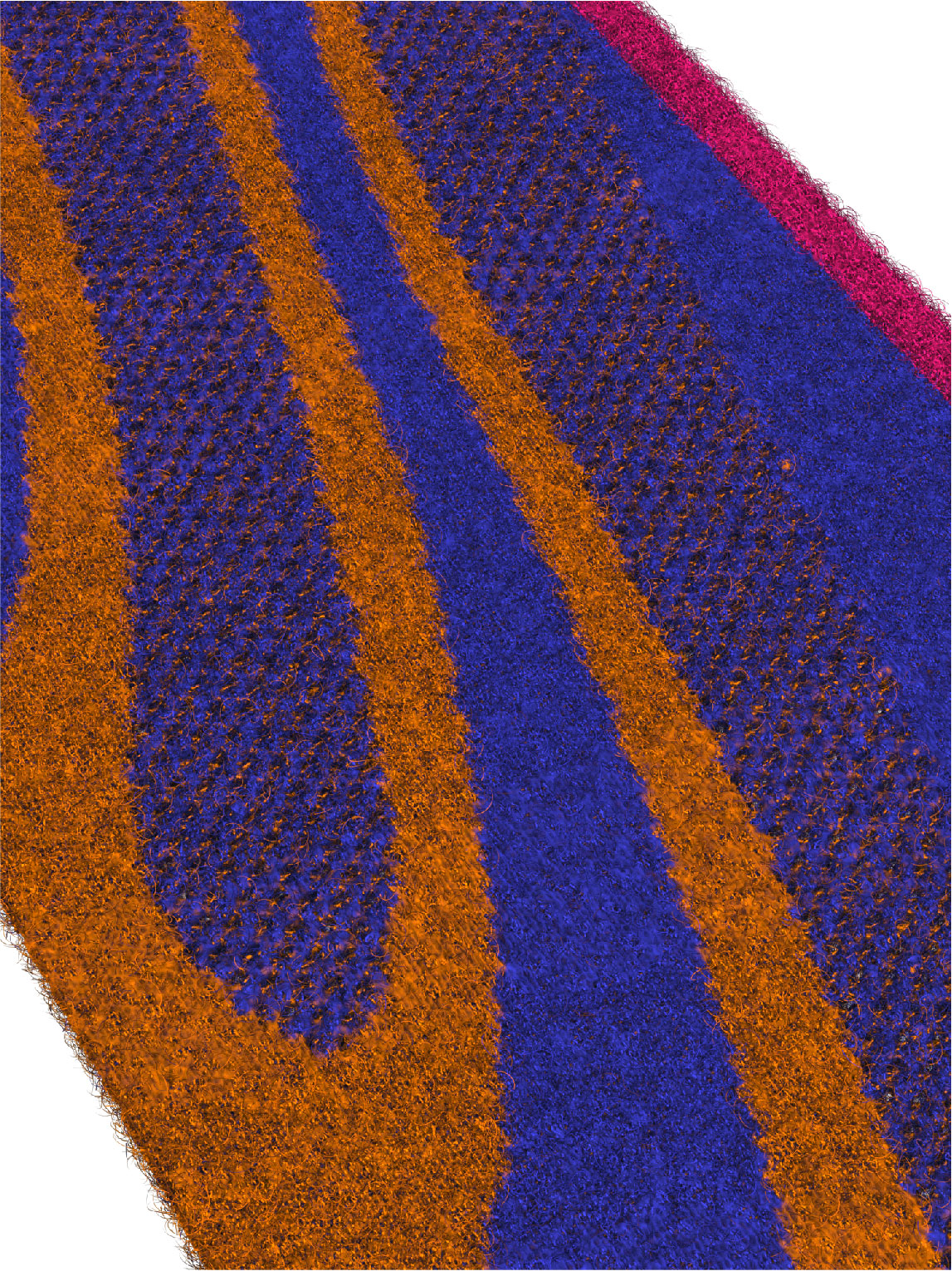 SCARF MOHAIR features a combination of tube jacquard knitting technique with alternating pointelle stitch structure, which intertwine organically in the artwork. The colorful intarsia knitted edge gives a vibrant accent to the scarf. It is knitted on our coarsest machine, yet feels airy, fluffy, and lightweight due to the fine Mohair yarn and manual brushing.